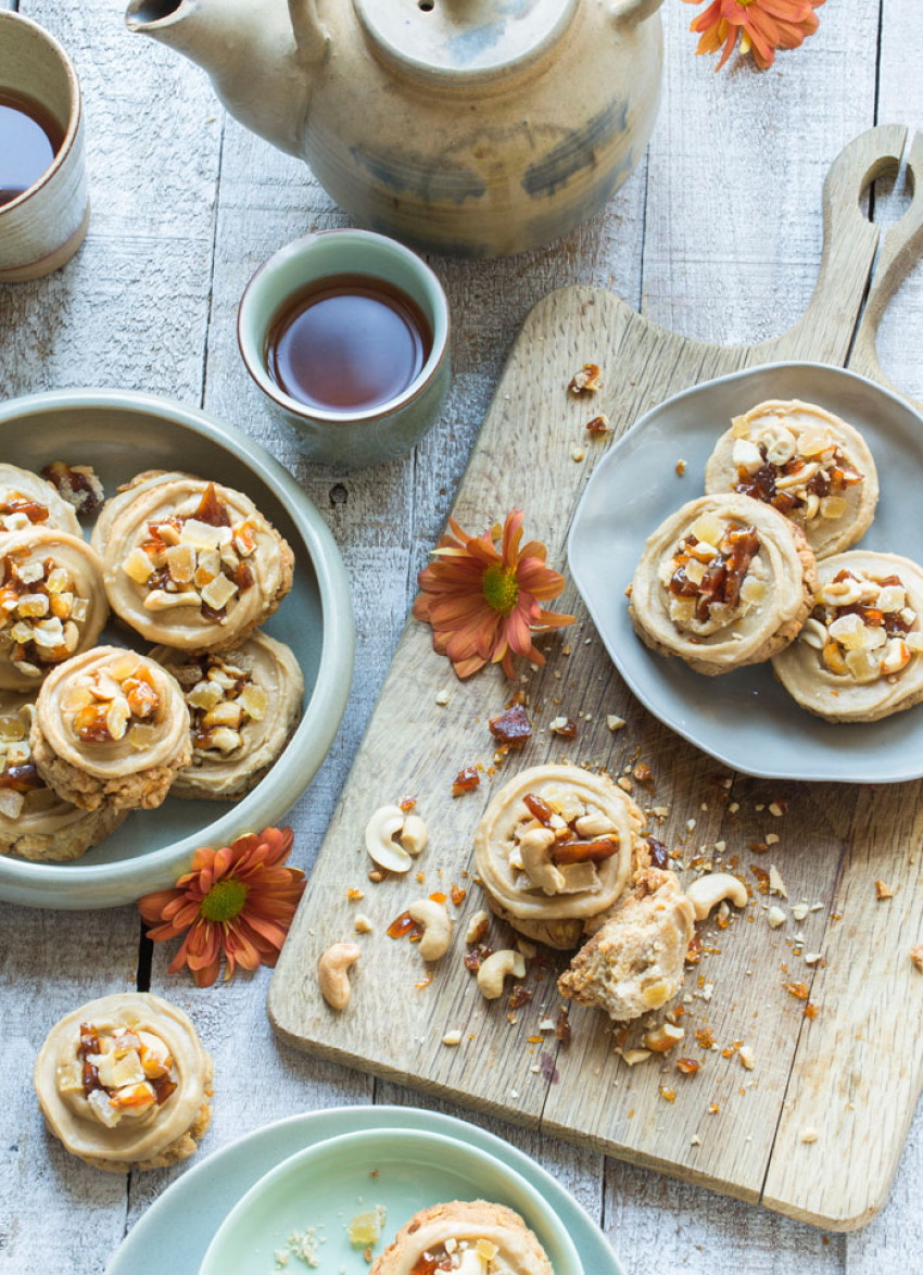 Spread 1 tablespoon of ginger icing over each cookie. Sprinkle over the salted cashew praline and the crystallised ginger.