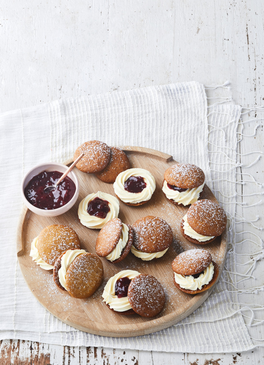 Not the traditional recipe but a bit of a combination of Ginger Gems and Ginger Kisses. Using fresh cream and jam, fill just before serving.