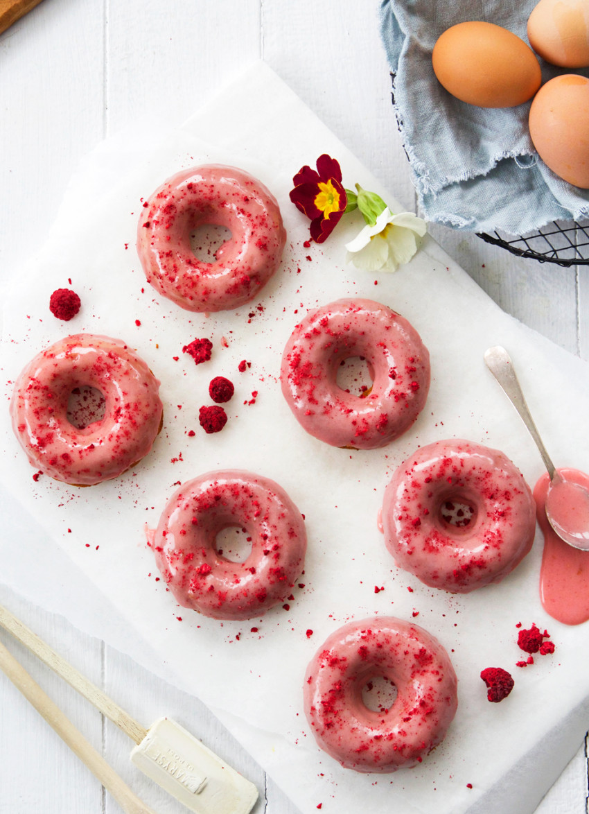 Dip the smooth side of the doughnuts into the frosting. Sprinkle with freeze-dried raspberries. Ideally, enjoy within a few hours of making to ensure the texture is light. They will, however, last for 2–3 days in an airtight container. Makes 6 doughnuts