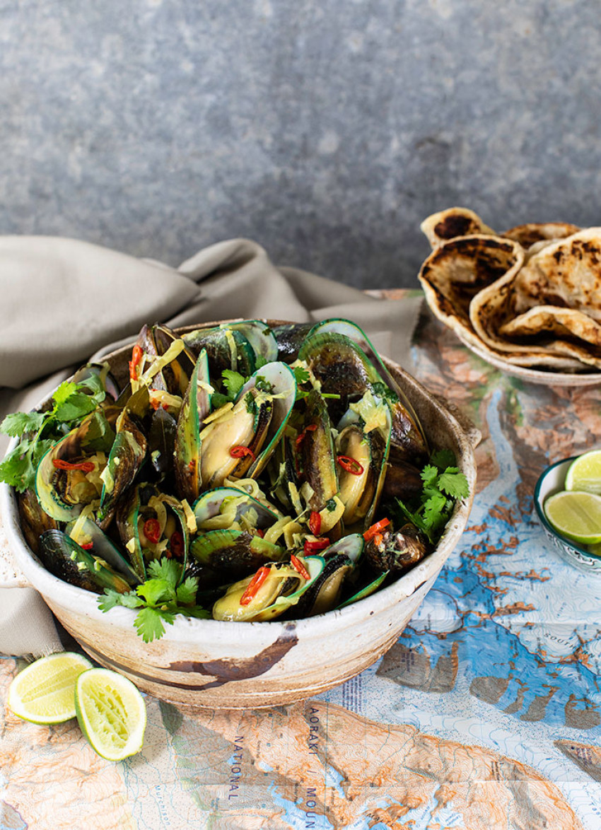 These fragrant mussels can be served on their own as an entrée or with rice or naan to mop up their delicious broth.