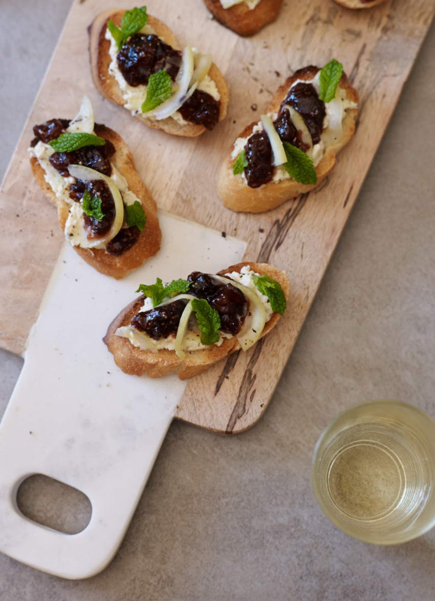 To assemble: Spread the baguette with goat’s cheese then top with a spoonful of fig relish. Add a few slices of cured lemon and a drizzle of honey and olive oil. Finish with a grind of pepper and some mint. Makes 8