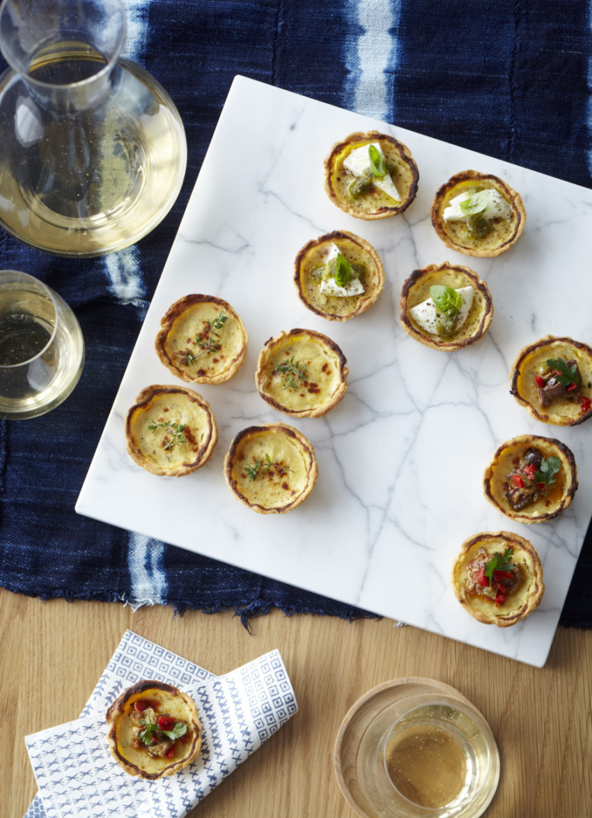 Bake for 20-25 minutes until the filling is puffed and the pastry is cooked and golden. Leave until just warm then remove from the tins. The tarts will deflate on cooling. Place on a serving platter and add the toppings of choice. Serve warm. Makes about 16.