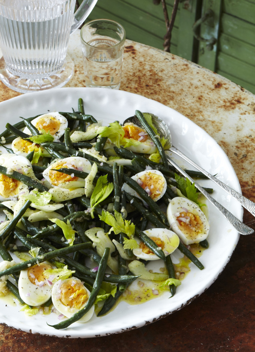 To serve: Toss the beans, celery and the tender leaves with the dressing then lift out and transfer to a serving platter. Slice each egg into 3 and tuck into the beans.
