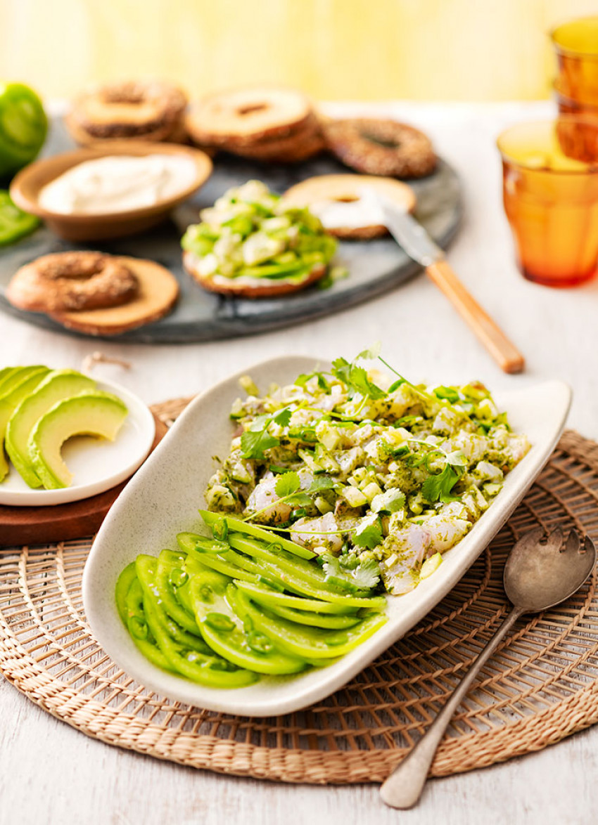 To serve: Place the tomatoes and fish in a serving bowl and arrange the remaining ingredients alongside. Spread the bagels with sour cream then top with tomato, avocado and the fish.
