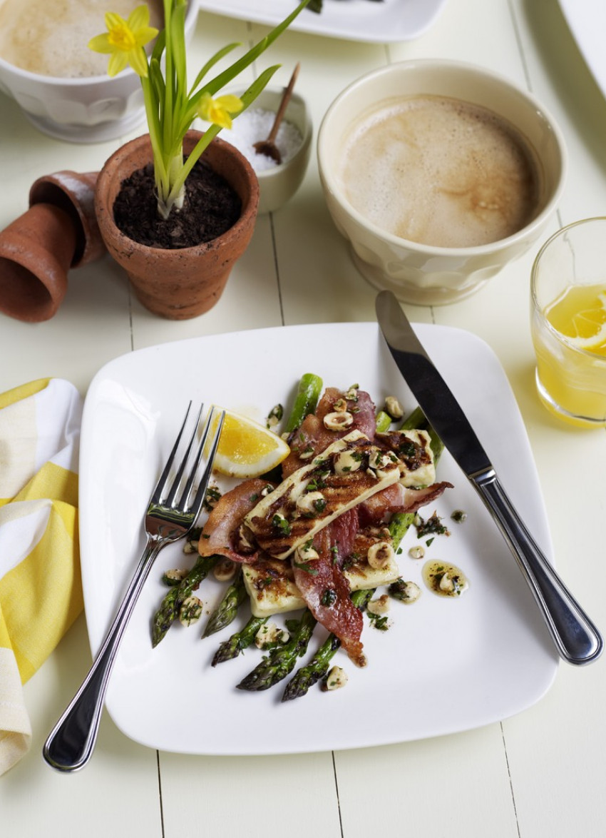 To serve: Arrange the asparagus on plates and top with the bacon and haloumi. Spoon over the warm dressing and serve immediately.