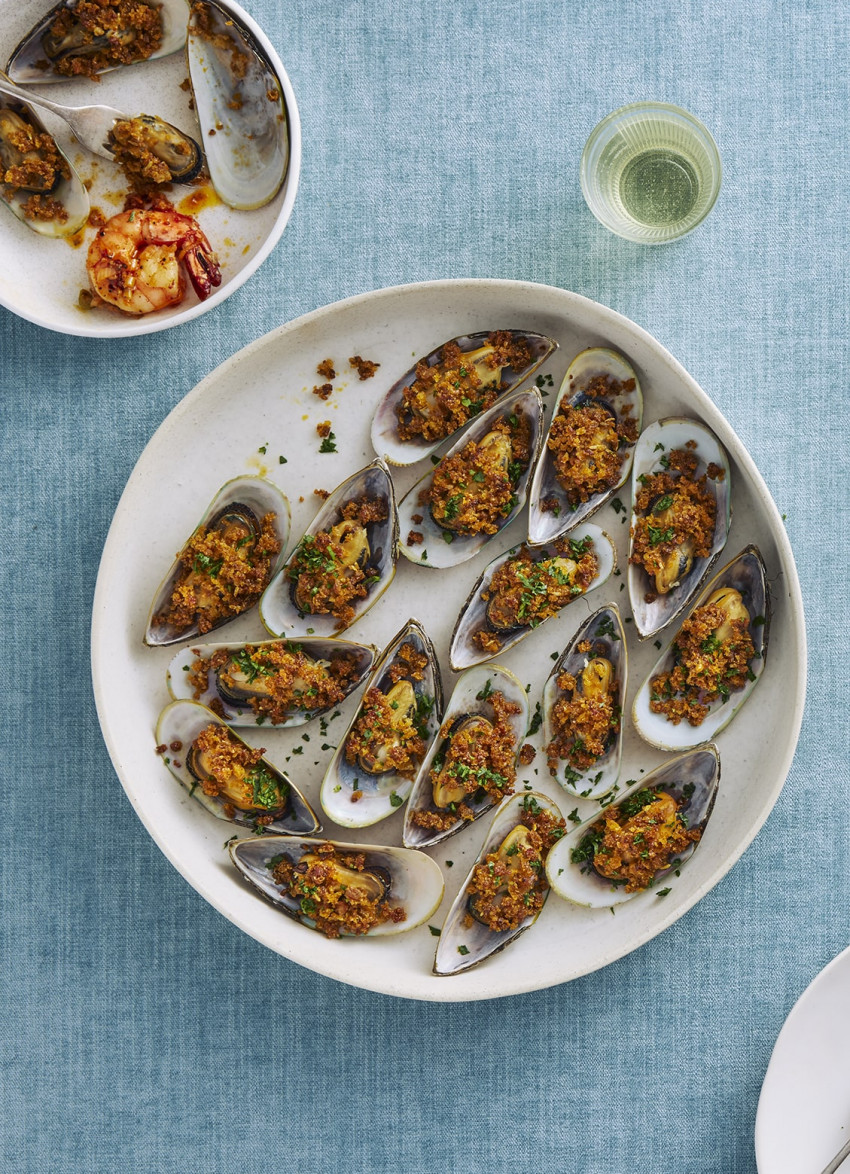 Grilled Mussels with Crispy Chorizo, Parmesan and Fennel Crumbs
