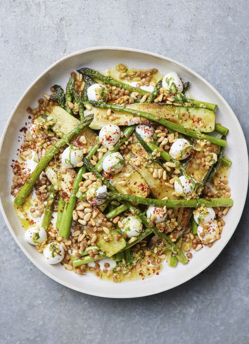 To serve: Spread the yoghurt on a large platter and scatter over the lentils. Layer up the zucchini and asparagus and add the mozzarella. Add the pine nuts and mint to the dressing, then drizzle everything with the dressing and a sprinkle of chilli flakes.