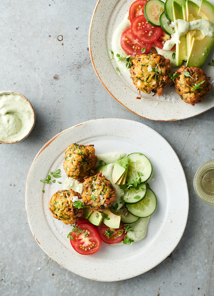 Place the zucchini in a large bowl with the haloumi, egg, herbs, flour and spice mix. Mix well to combine then form tablespoons of the mixture into 10-12 large walnut-sized balls. The mixture will be quite soft at this point but firms up as the cheese melts when cooked. Place the balls on kitchen towels to absorb any moisture.