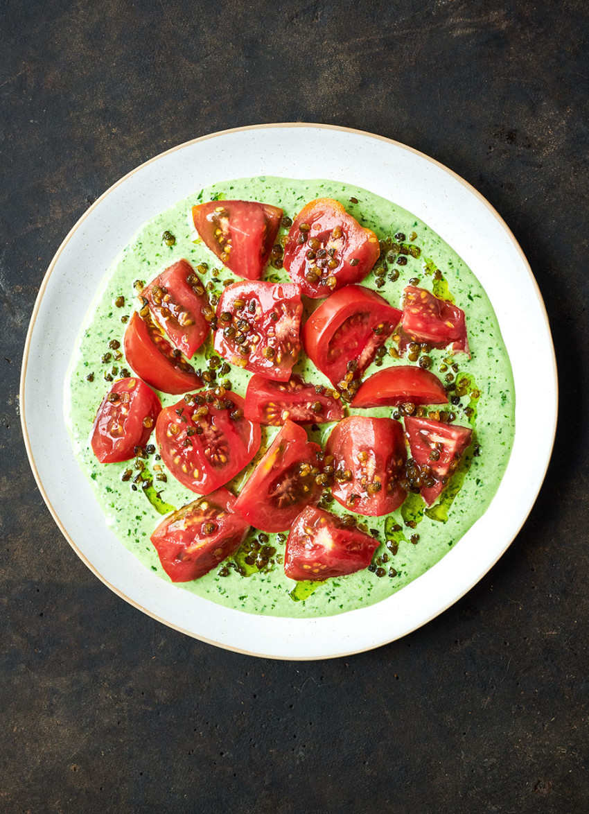 Top with the heirloom tomatoes and finish with a generous sprinkle of the fried lentils.