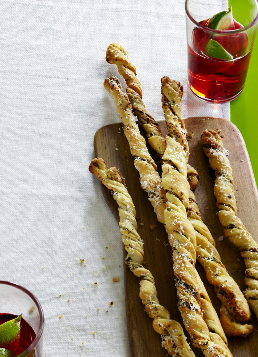 Cut into 1 cm wide strips, they should be about 25 cm long, and twist each piece from both ends. Place the twists 2 cms apart on a lined baking tray, brush with garlic oil and sprinkle with sea salt. Bake for 8 minutes then turn the sticks over and bake for a further 5-6 minutes or until they are golden. Rearrange the bread sticks on the tray for even browning if necessary.