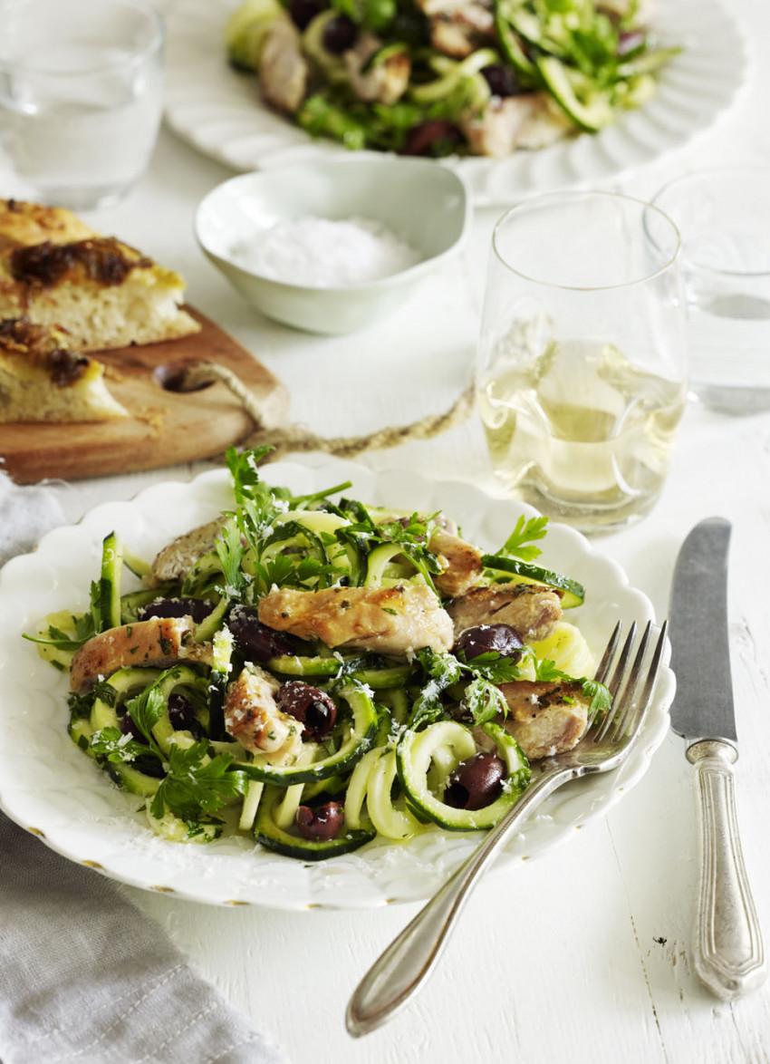 To serve: Divide the zucchini noodles between plates. Slice the chicken and place over the zucchini, spooning over the pan juices. Add parsley and olives then top with a good grating of parmesan.
