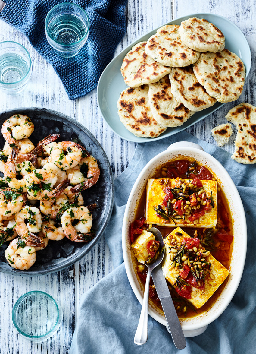 Cooks Tip: We served our baked feta and flatbreads with a bowl of prawns, sauteed in oil, garlic and parsley.