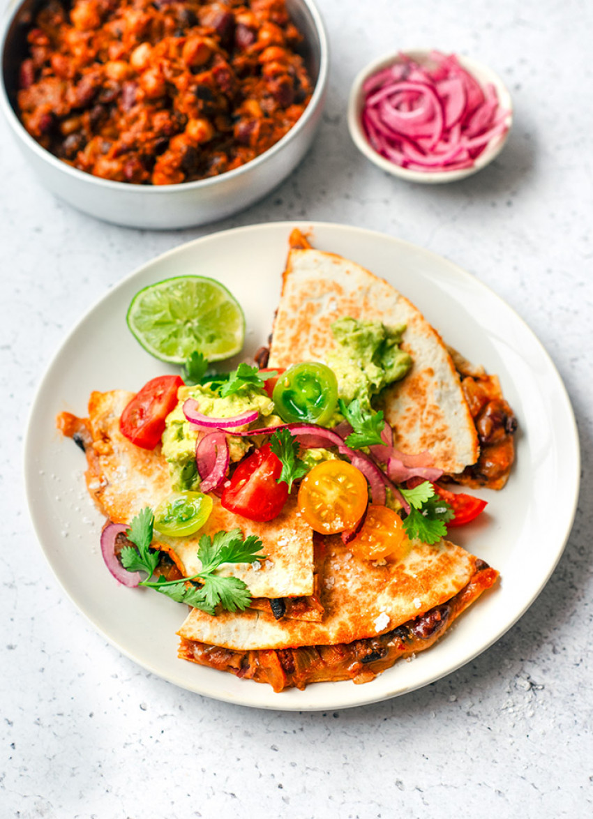 Heat a large sauté pan over a medium heat. Place one tortilla in the pan and load up with the bean mixture and the cheese and top with the second tortilla.