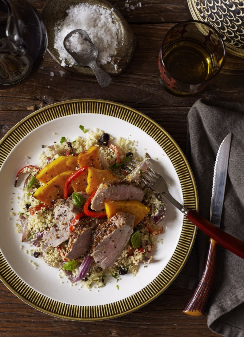 To serve: Place the couscous on plates. Slice the pork thinly on the diagonal and arrange on top of the couscous along with the pumpkin.