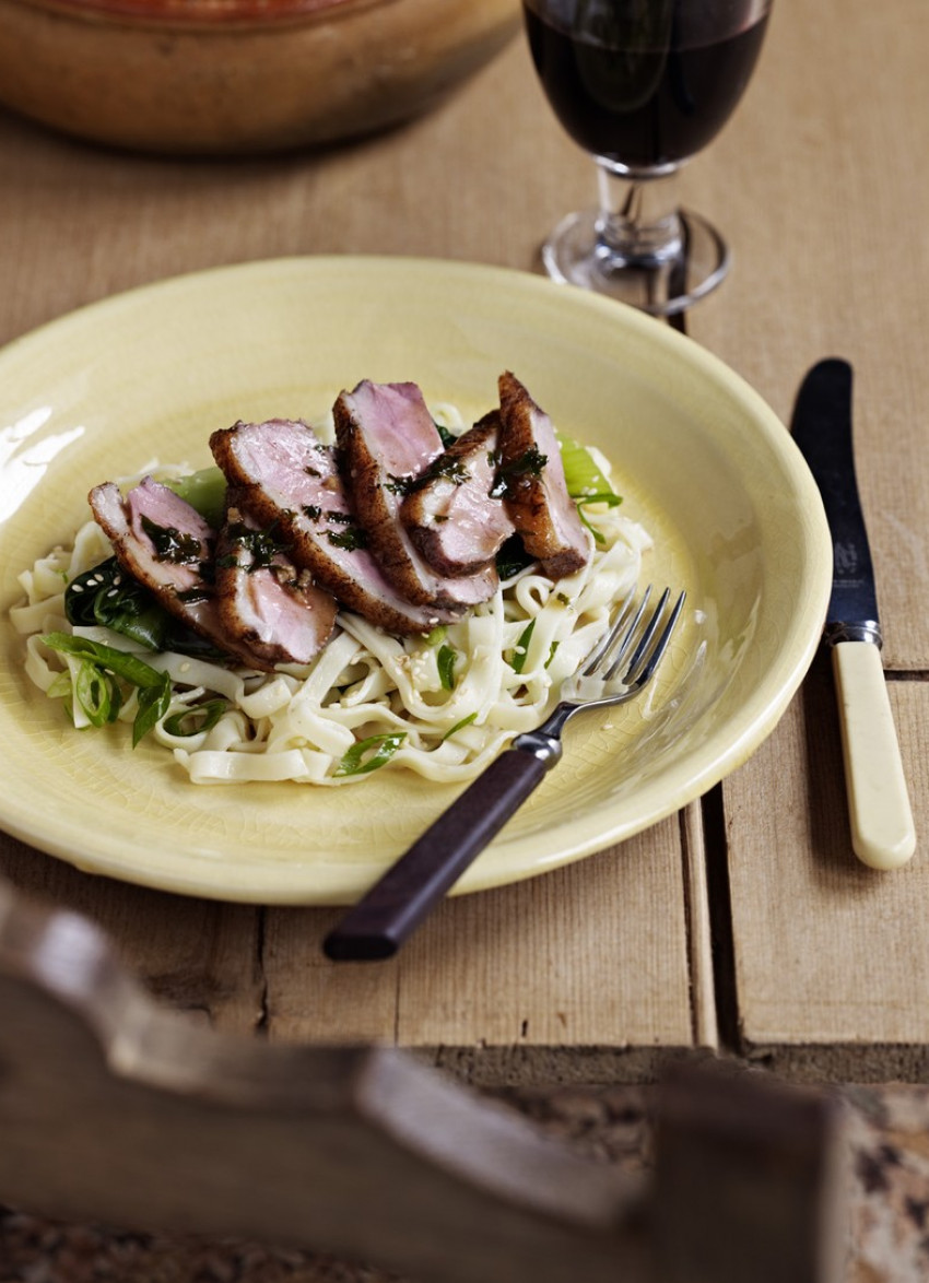 To serve: Cook the noodles in boiling salted water until tender. Drain and toss with the sesame oil, spring onions and sesame seeds. Divide between shallow serving plates, adding the cooked bok choy if using. Slice the duck thinly on the diagonal and arrange on top of the noodles. Stir the meat resting juices into the sauce and spoon over the duck. Serve immediately.