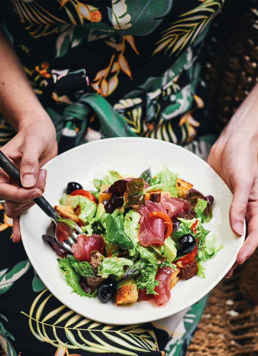 Add olives to the large bowl along with the lemon juice, 1 teaspoon of flaky salt (or to taste – depends on the saltiness of the olives), and freshly ground pepper. Mix to combine. Wash and dry iceberg leaves and break into small pieces. Add them, the baby salad mix, canned tuna if using, avocado, sugar snaps or asparagus, and sliced peppers and any juices to the large bowl and toss together. Check seasoning, place fresh tuna on top, if using, and serve with croûtons on the side. Feast immediately!