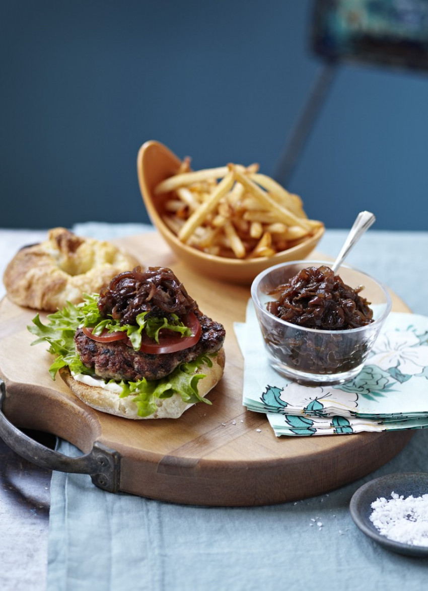Red onion jam: Heat the oil in a medium sauté pan. Add the onions with a good pinch of salt, cover and cook for 10 minutes, stirring occasionally. Add the sugar and garlic and cook for 1 minute. Add the vinegar and bring to the boil. Reduce the heat and simmer uncovered, stirring occasionally, for 10 minutes or until most of the liquid has evaporated and the onions are glossy.