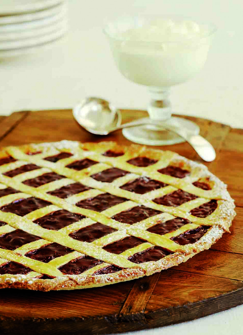 Spread the jam evenly over the pastry and brush the edges with egg wash. Place the strips over the jam and press onto the rim of pastry then brush with egg wash. If the pastry starts getting soft, put it back in the refrigerator to firm up. Bake the crostata for 35-40 minutes or until golden and the pastry is thoroughly cooked. Set aside to cool.