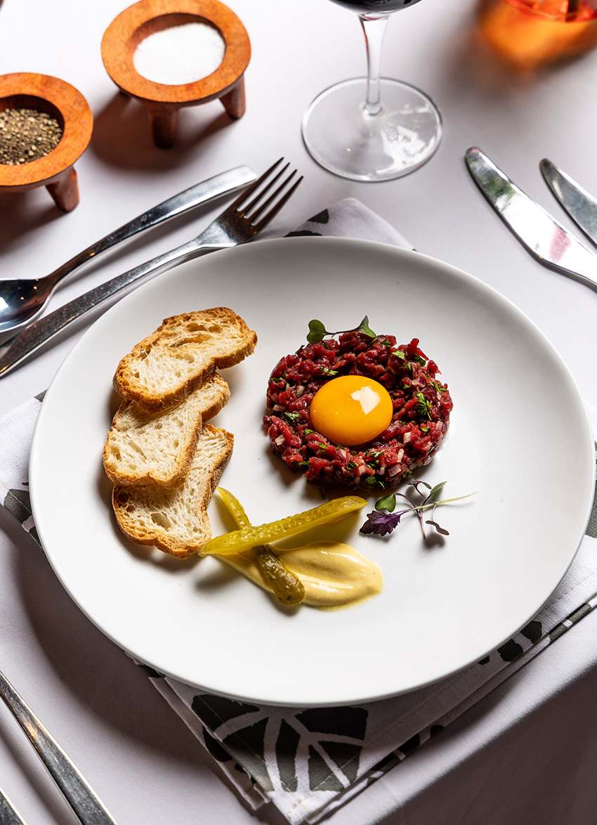 TO SERVE: Place a 10cm ring mould on each serving plate, fill each with a quarter of the beef mixture, make a hollow and place an egg yolk in the hollow. Smear the plates with mustard, add cornichons, drizzle with truffle oil and serve with toasted baguette.