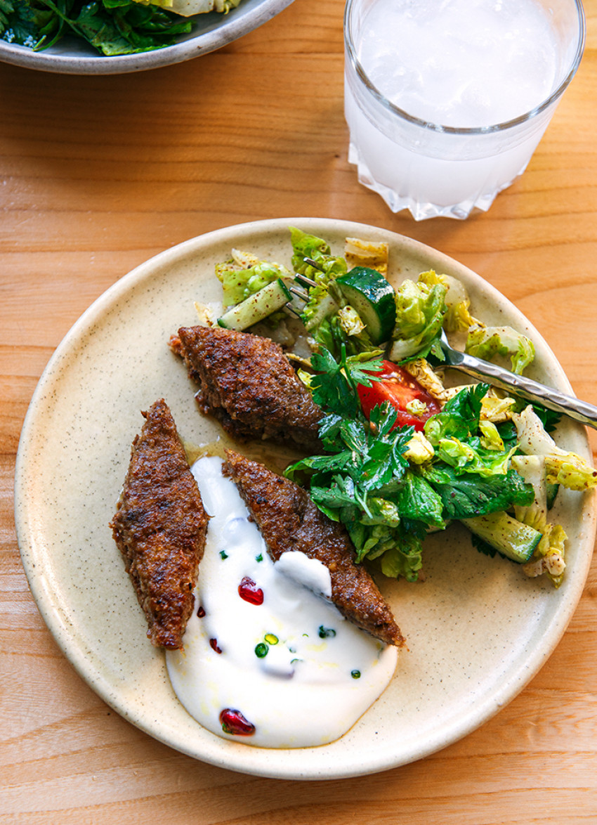 Using a knife, cut a diamond pattern into the kibbeh, brush with olive oil and bake for 30 minutes, or until lightly golden on the top. Enjoy hot or cold with yoghurt and fattoush salad.