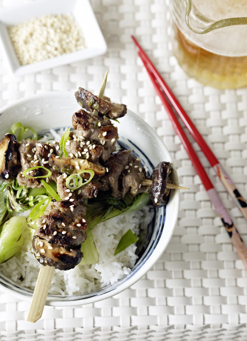 Take your barbecue to new heights with these Korean-inspired beef skewers. Omit the rice for an Asian slaw for something lighter.