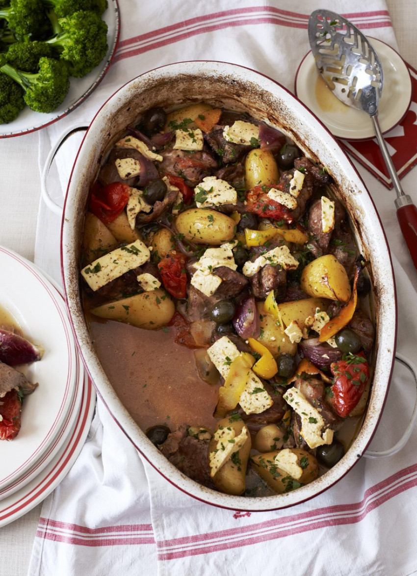 Uncover the lamb and top with the feta, spooning some of the pan juices over the top. Bake uncovered for a further 15-20 minutes or until the feta is lightly golden and the lamb is very tender.