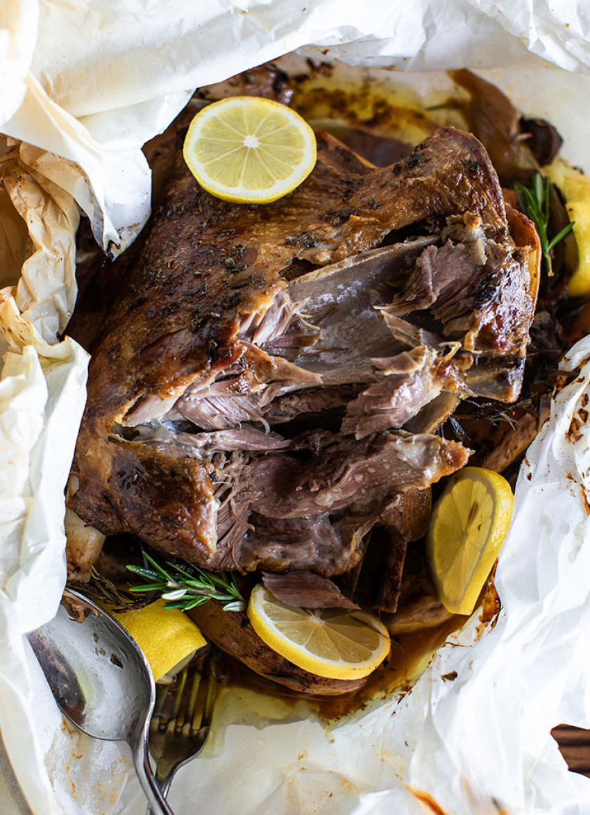 Place the lamb shoulder on top of the vegetables. Slice one lemon and place on and around the lamb shoulder. Drizzle the juice of a second lemon and the remaining olive oil over the lamb shoulder, and sprinkle with a generous amount of ground pepper. Wrap the paper around the lamb and secure the parcel with kitchen string.