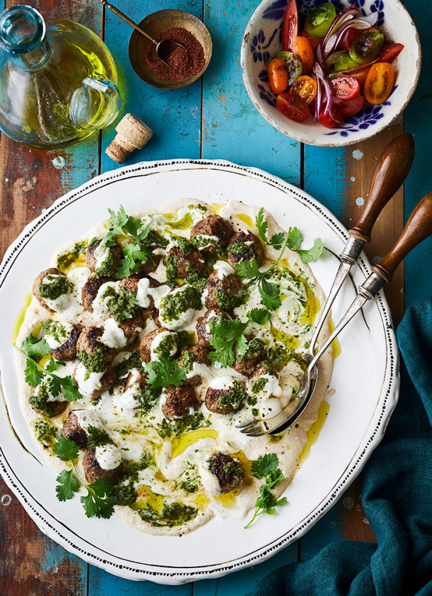 To serve: Spread the purée on a large platter and top with the kofta. Dollop over the Herb and Caper Salsa and yoghurt, then finish with a drizzle of olive oil and fresh coriander. Serve with warm flatbreads. Serves 6–8.