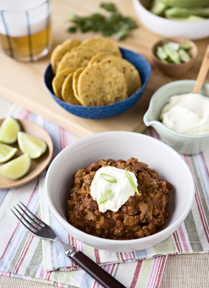 To serve: Spoon the chilli into serving bowls and top with sour cream, spring onions and coriander. Serve with avocado and taco chips.