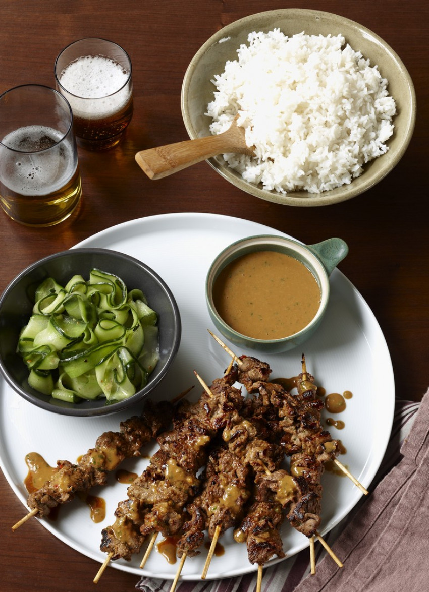 To serve: Arrange the skewers on a platter with the cucumber salad and serve with hot cooked rice and the remaining korma sauce.