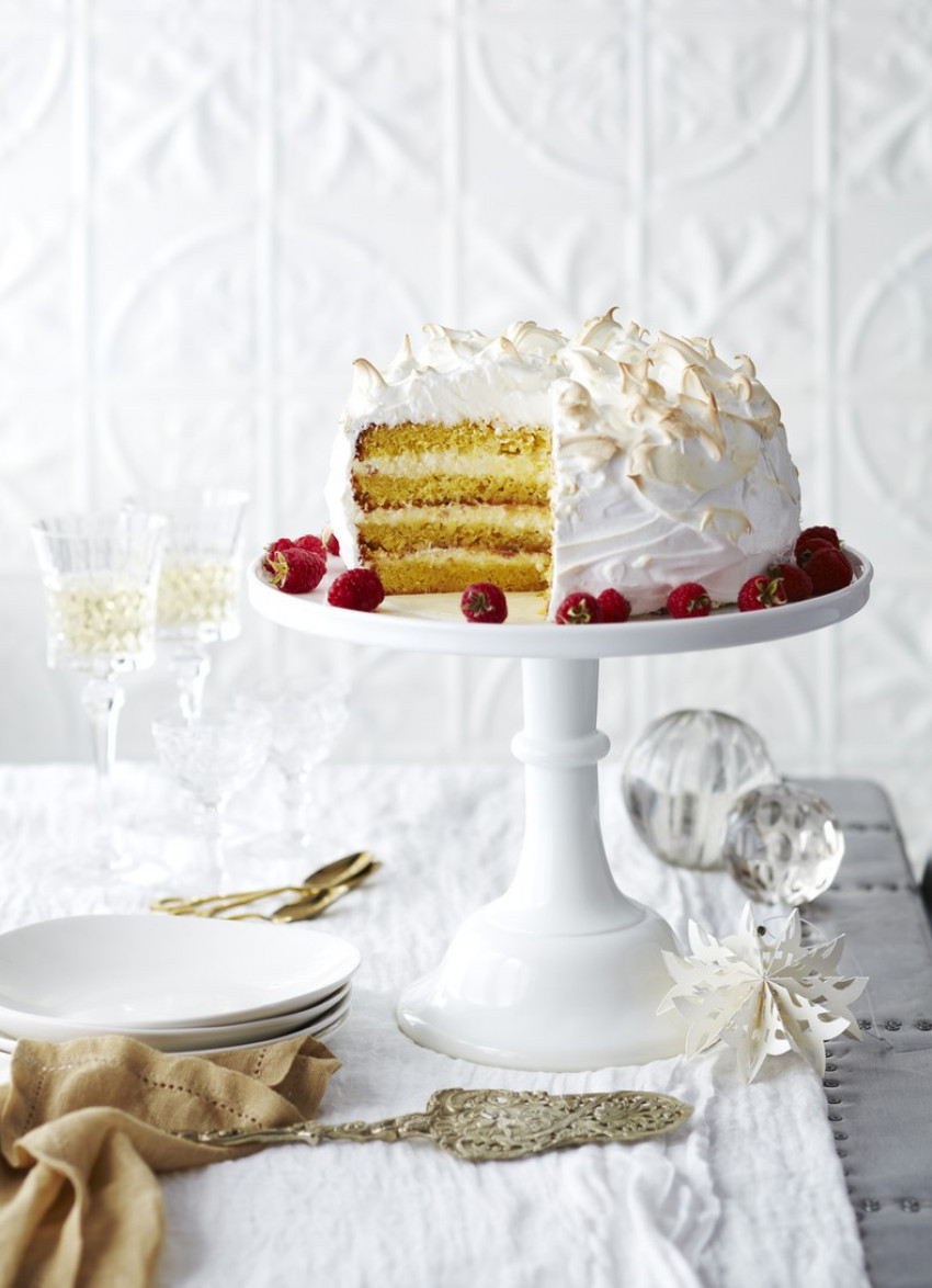 Don’t be put off by the length of this recipe. Make the syrup a week ahead and make the cakes the day before, then it’s just a matter of combining the filling, sandwiching the layers and whipping up the meringue with a flash through the oven. Scrumptious perfection.
