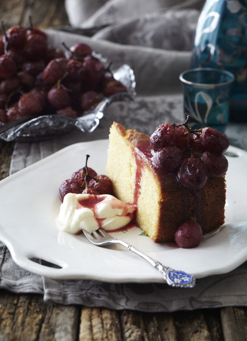 It’s hard to go past a lovely moist lemon cake – and it’s even more divine when topped with syrupy roasted grapes and a dollop of cream.