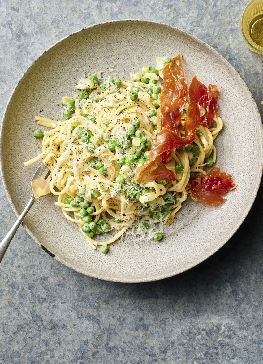 Linguine with Fennel, Peas, Crème Fraiche and Crispy Prosciutto
