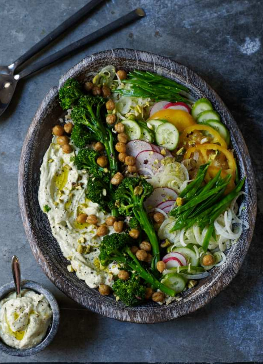 Arrange all the vegetables over the top then scatter over the chickpeas and pistachios. Drizzle everything with olive oil, salt and pepper. Serves 4-6 depending on how many vegetables you use.