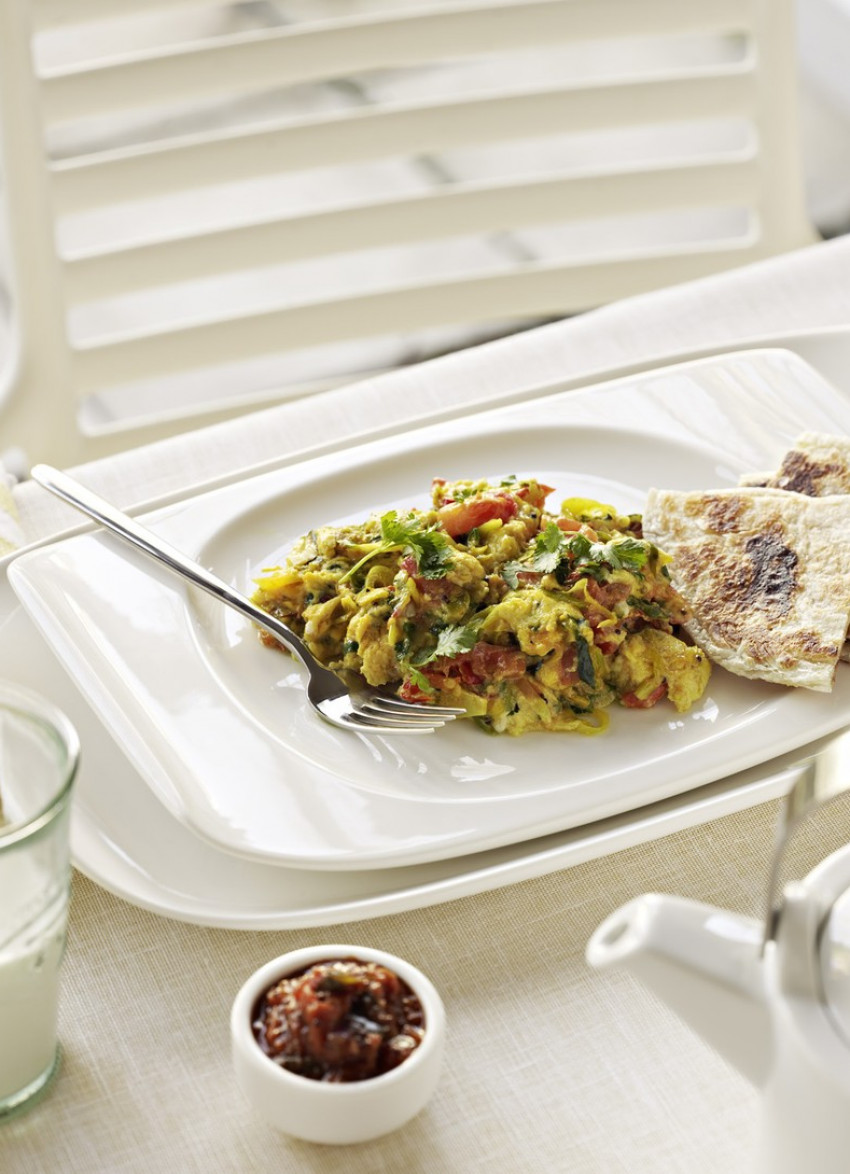 Eggs: Heat both the oils in a non-stick sauté pan over a medium heat and fry the onions, mustard seeds, turmeric, garlic, chilli and ginger until the spring onions are tender. Add the tomato and cook for 1 minute.