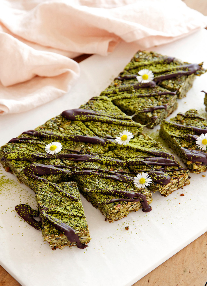 Matcha powder is a very pure form of green tea. Its intense flavour works beautifully with vanilla, maple syrup and, quite surprisingly, chocolate. The slice freezes well and is a great way to get yourself sorted for a couple of weeks of good snacking.