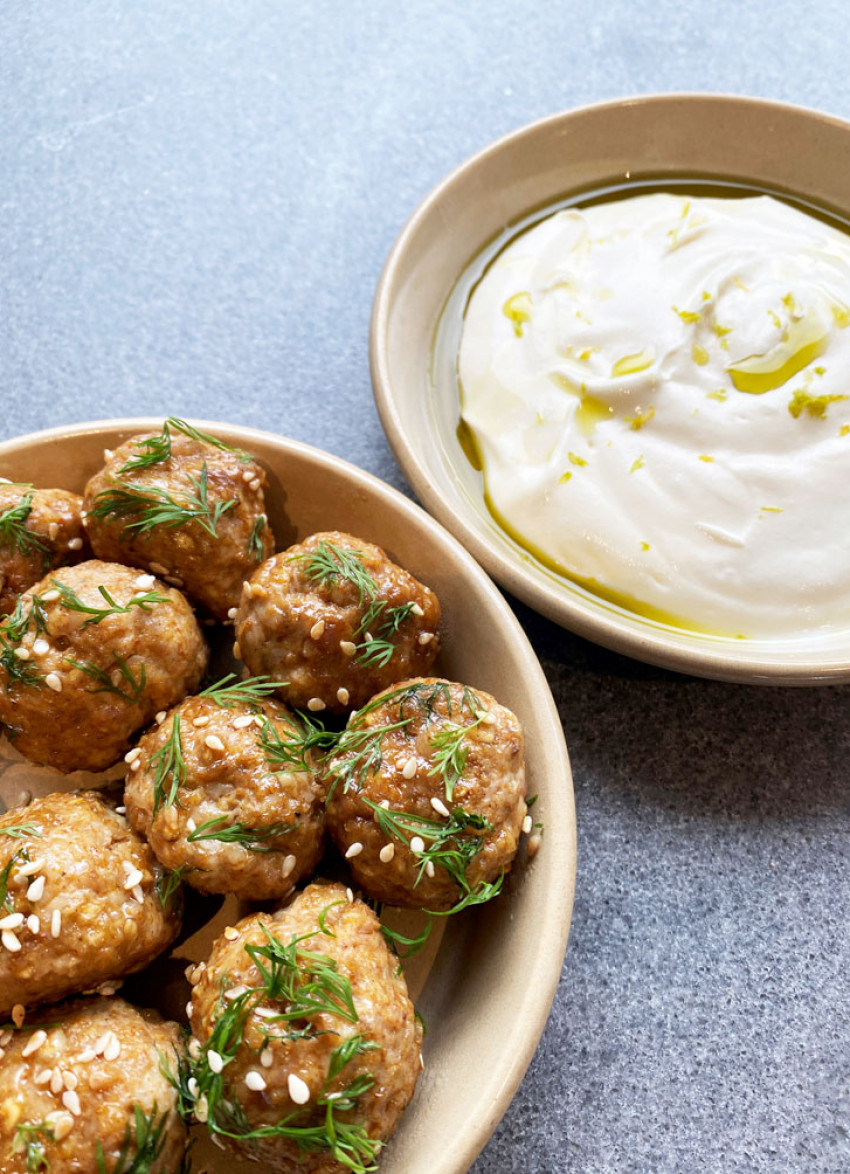 To serve: Remove the meatballs from the oven and place in a large bowl. While the meatballs are still hot, drizzle with olive oil and pomegranate molasses and toss to coat. Sprinkle with more sesame seeds and fresh dill. Place the dipping sauce in a small bowl and grate additional lemon zest over the top. Serve the meatballs on a platter with the dipping sauce.