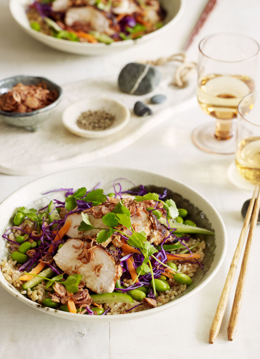 To assemble: Divide the hot cooked rice between bowls and top with the vegetables. Slice the chicken thinly and arrange over the top and spoon over the pan juices from roasting the chicken.