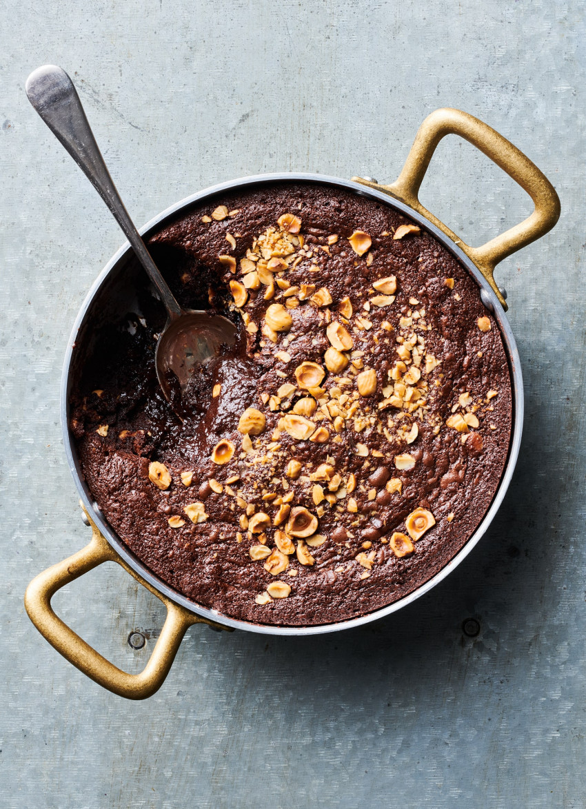 Stir in the melted chocolate, then use a large metal spoon to fold in the flour and salt. Stir in half the hazelnuts and tip the mixture into the baking dish. Scatter over the remaining hazelnuts and bake for about 20-25 minutes, or until the pudding is set but still with a little wobble in the centre.