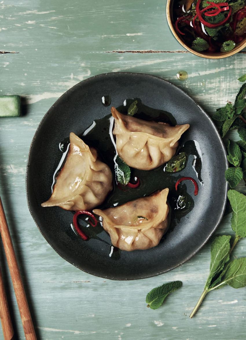Drain the dumplings and let them cool slightly. For the dipping sauce, mix the ingredients together in a small bowl and set aside. Pan-fry the dumplings in the sunflower oil over a medium heat until lightly brown and crisp at the base. Drain on paper towels and serve immediately with the dipping sauce. Makes 16