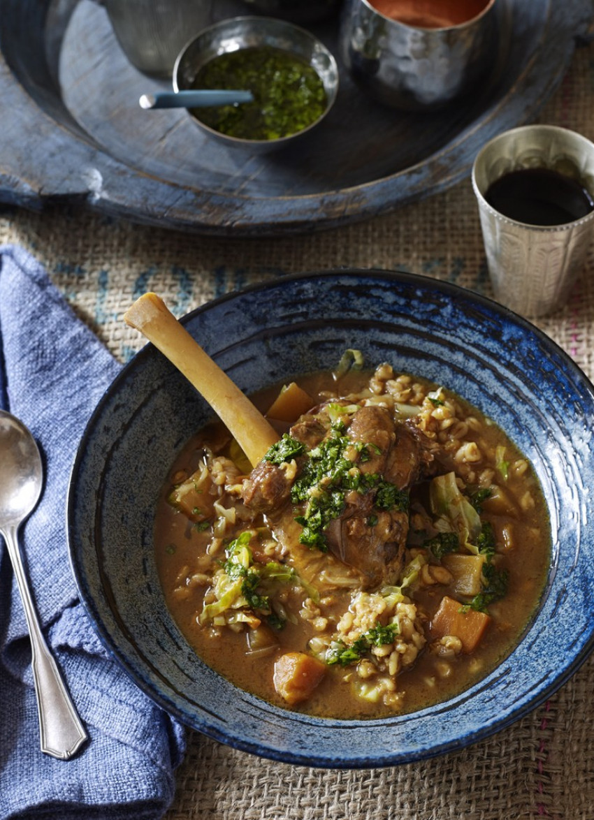 To serve: Place 1 shank in each bowl and ladle over the soup. Top with a spoonful of the parsley oil. Serves 4 or will serve 6 if the meat is removed from the shanks and added to the soup.