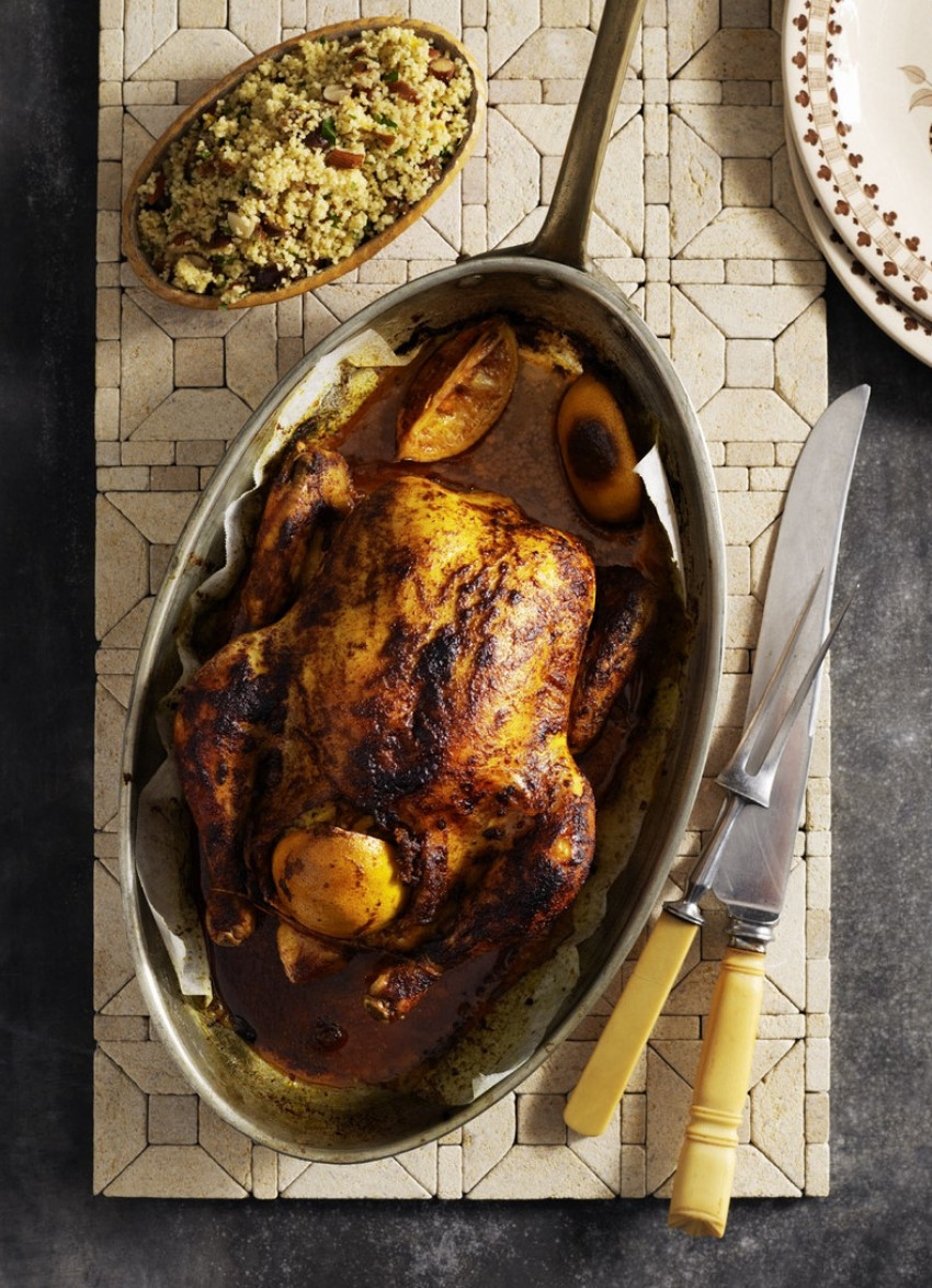 Rest the chicken loosely covered for 10 minutes before transferring to a platter and carving. Squeeze over the roasted lemon and serve with the reserved couscous.