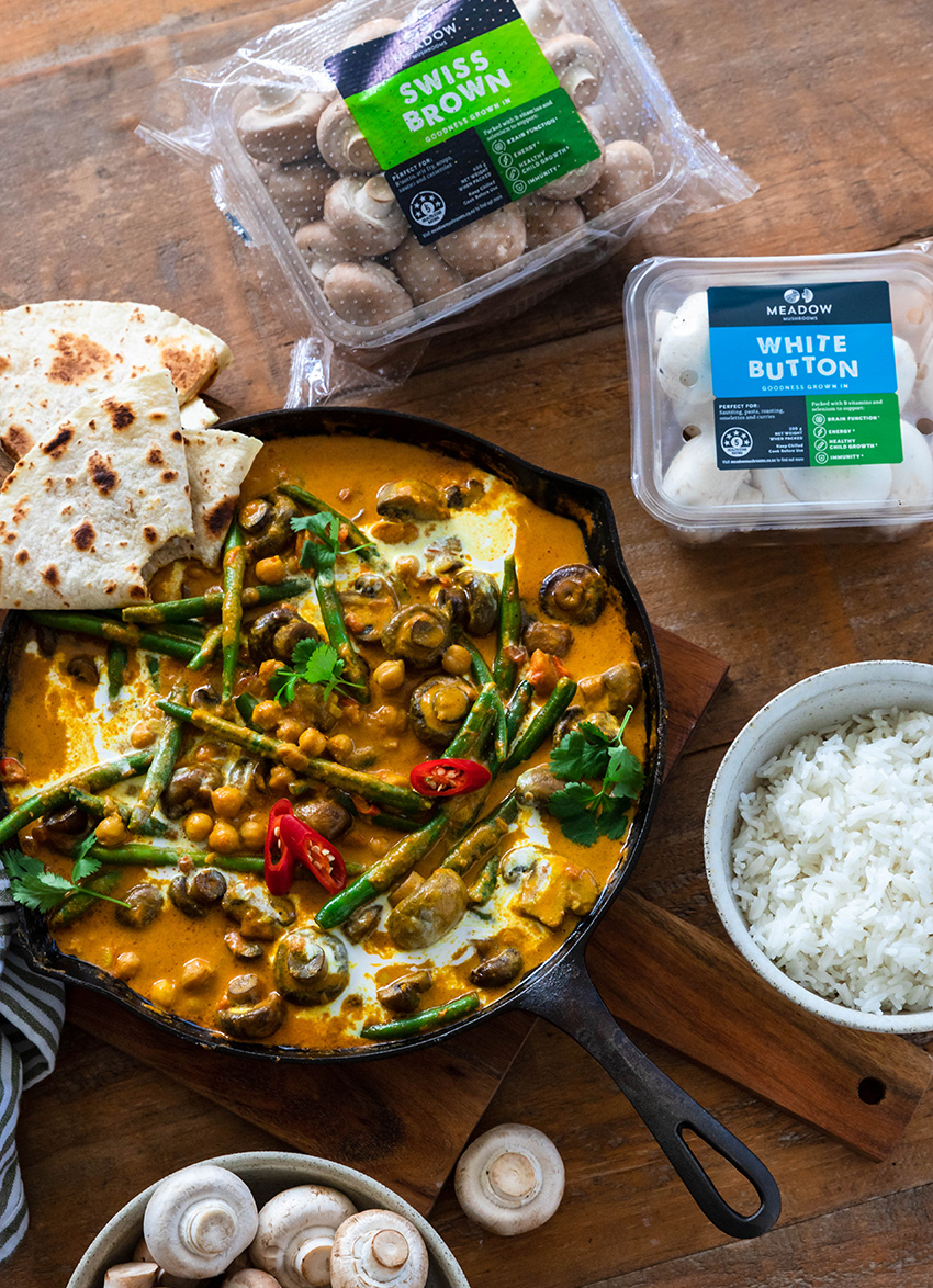 Stir through the chickpeas, coconut milk and tomatoes. Bring to a boil and then simmer for 15 minutes to thicken sauce and allow time for the flavours to develop. Add the mushrooms and green beans. Simmer for another 5 minutes. Taste and season generously.