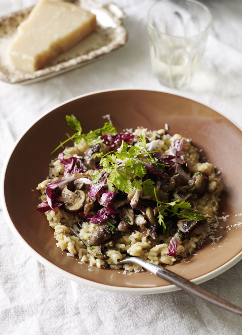 Using a combination of dried and fresh mushrooms, the addition of radicchio adds a pleasant bitterness to cut through the richness of the risotto.