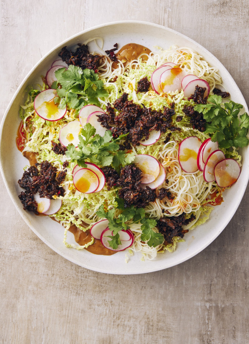 Napa Cabbage and Crunchy Radish Peanut Noodle Slaw with Cheat’s Mushroom XO Sauce