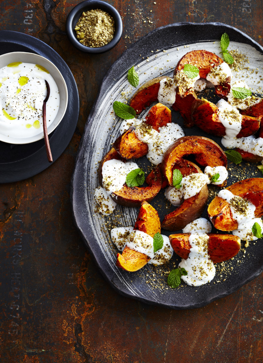 To serve: Arrange the pumpkin on a serving plate and top with dollops of yoghurt. Sprinkle over the dukkah, mint leaves and a grind of pepper.