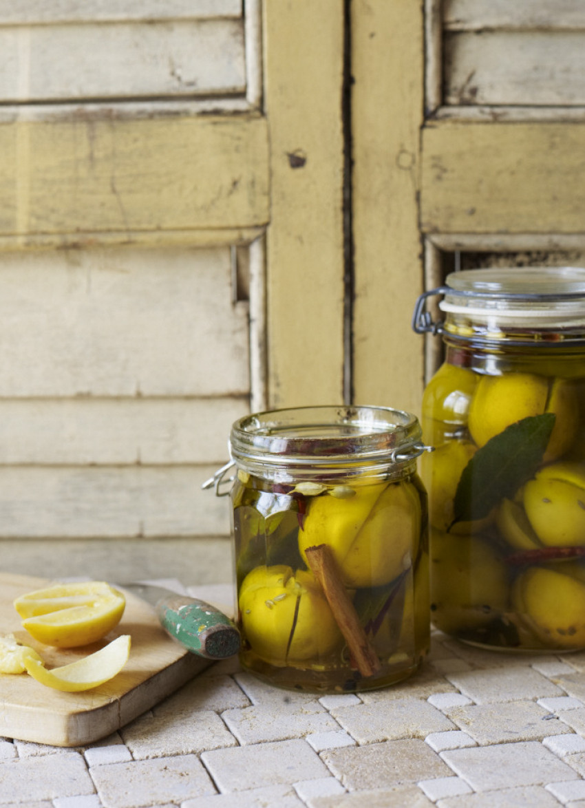 Carefully lift each lemon out of the dish, leaving the juices behind but including all the undissolved salt left inside the lemons. Layer the lemons and aromatics in each jar then add enough oil to fill the jars and completely cover the lemons. Seal and leave for at least 2 weeks in a cool dry cupboard.