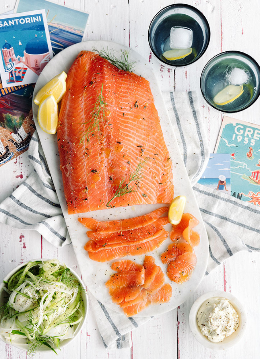 I love to serve this salmon with a salad of thinly shaved fennel, fennel fronds and cucumber tossed with a little olive oil and lemon juice. A bowl of crème fraîche thinned with the juice of a lemon and seasoned with salt and pepper is also a delicious accompaniment.