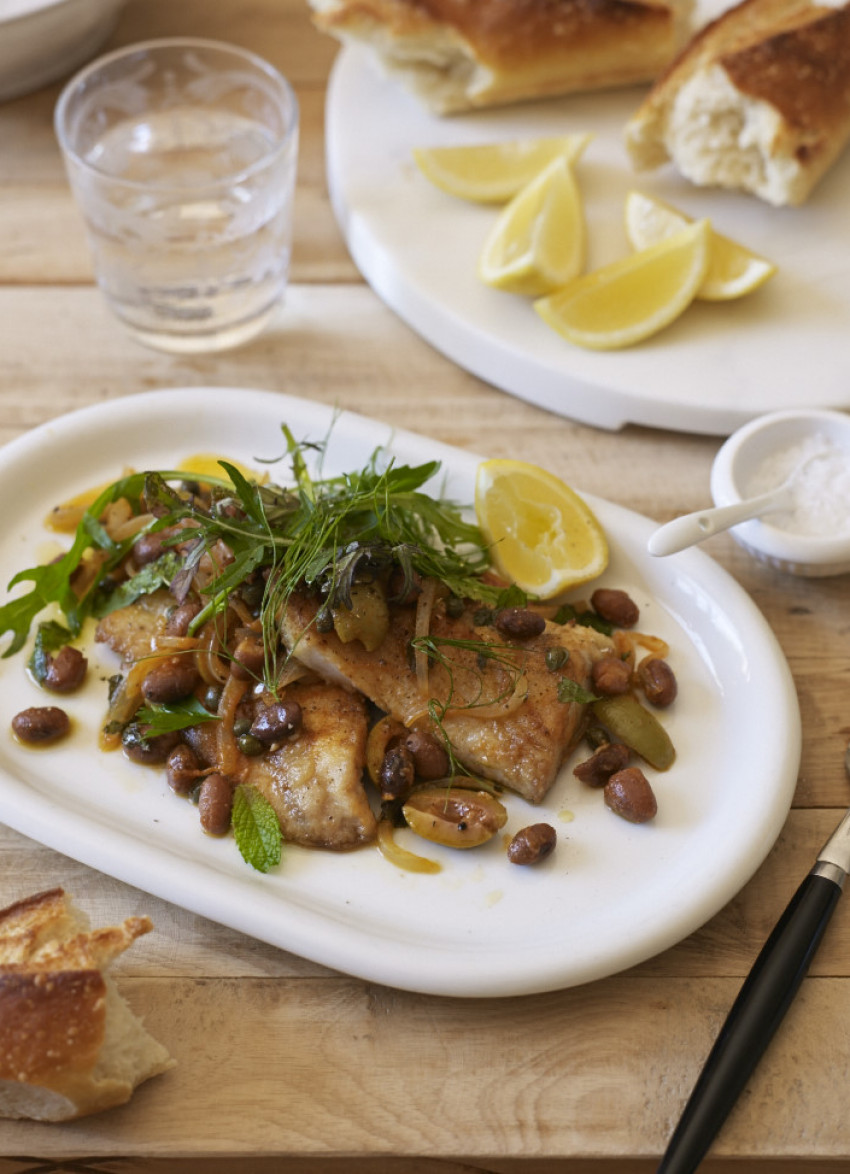 To serve: Stir the herb into the beans. Place the fish on plates and spoon over the beans. Top with a pile of salad, a grind of pepper and a drizzle of olive oil.