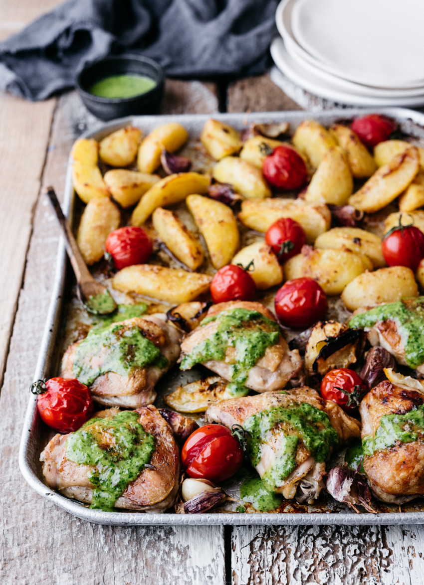 Parmesan Roasted Chicken and Crispy Potatoes with Herb Dressing